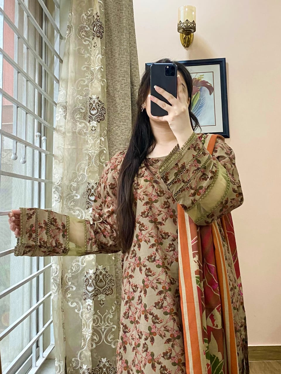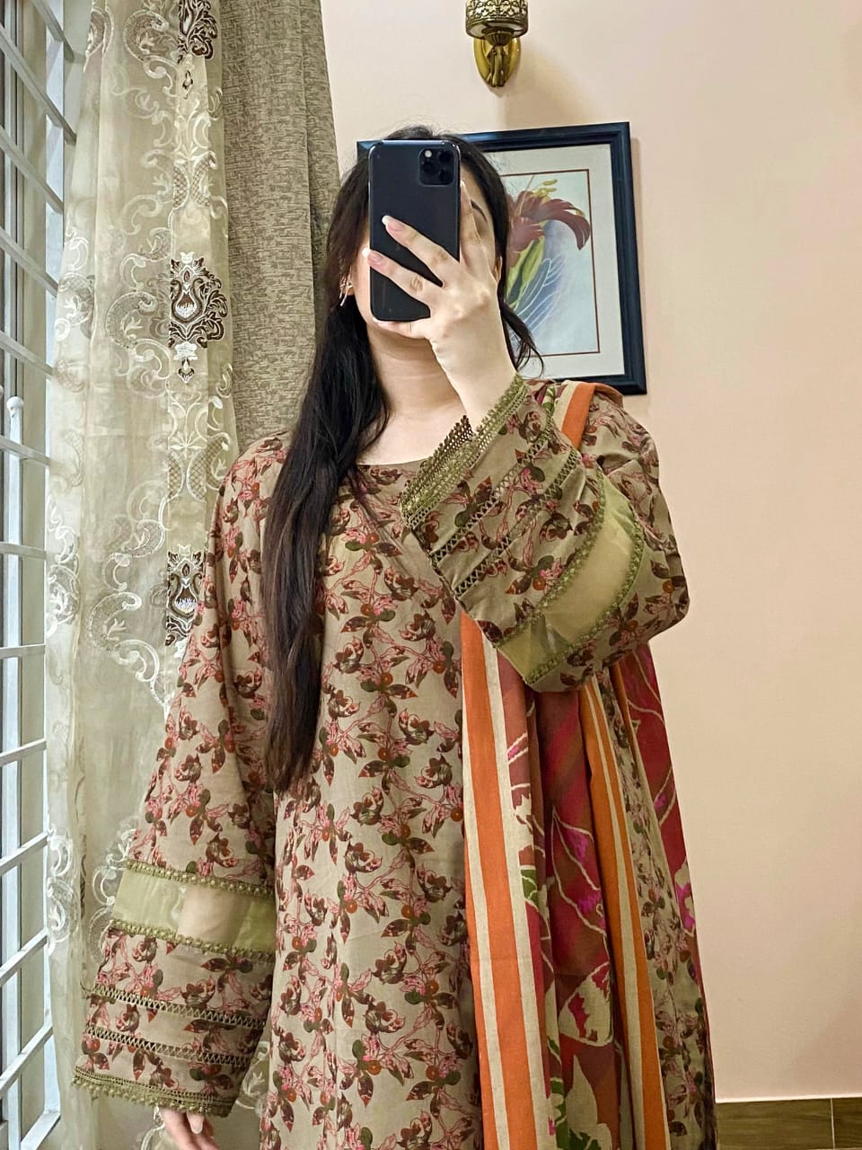 This premium LAWN shirt blends style with sophistication. Featuring a printed design, it includes intricate detailing on the neck and sleeves for a refined look. The classic round neckline is paired with lace embellishments on the sleeves. Fine tissue work adds a touch of elegance to both the sleeves and the center of the daman, creating a beautifully finished piece. Coordinated printed LAWN shalwar with stylish pin-tucks detailing at the bottom, offering a graceful and structured finish. Matching printed LAWN dupatta that completes the look with effortless charm.