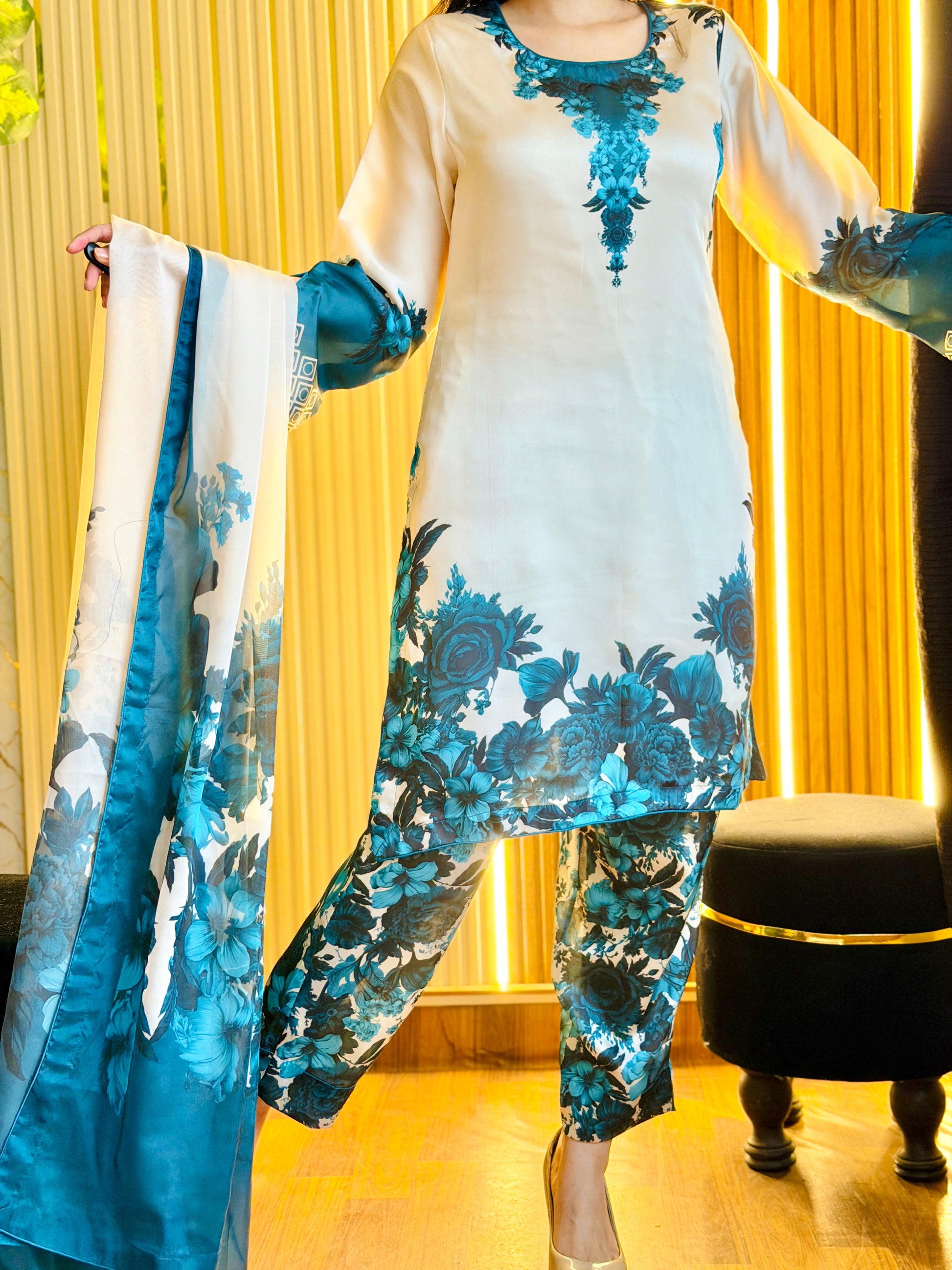 Digital Printed Silk Three-Piece Dress - stitched Digital Printed Silk Shirt Digital Printed Swiss Trouser Digital Printed swiss lawn Dupatta Best Three-Piece Women's Collection for Semi-Formal & Party Wears!